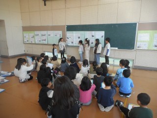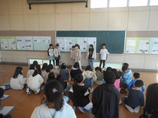 町探検に行って、見付けたことや気付いたことをまとめたことの報告会をしていました。