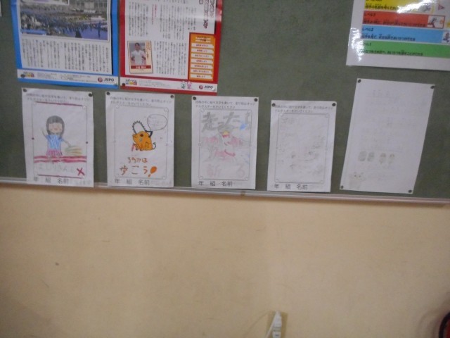 アニメやキャラクターなどの絵があったり、「ろうかは歩こう」などの言葉が書いてあったりします。