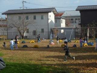 歩くだけでも回りますが、走るともっと速く回ることに気付いた子ども達。