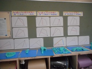 三角定規で頂点の角度や辺の長さを測ったり、友達と相談したりしながら学習をすすめていました。