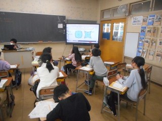 デジタル教科書を使って、モニターに映した図形が正八角形かを確かめます。