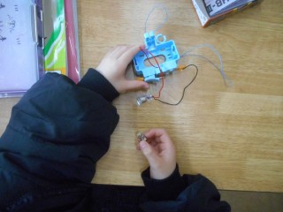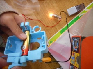 きちんと回路になっていないと明かりが点かないので、導線の接続を確かめながらスイッチを入れていました。