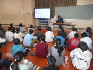 6年生一人一人が作成した「まちづくり」について課題と解決策をまとめたプレゼンを、7名の児童が全体の前で発表しました。