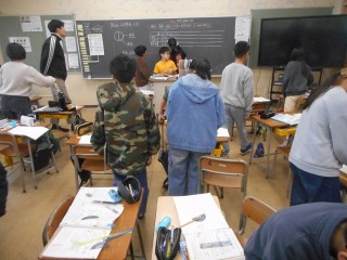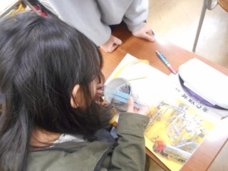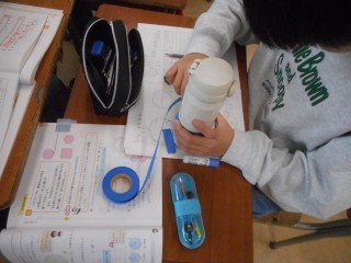 正多角形と円の学習で、円の円周と直径との関係を具体物を使って調べていました。