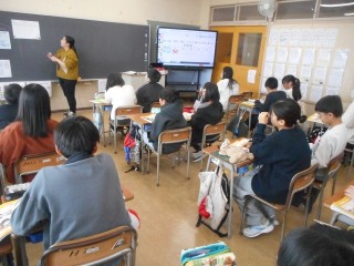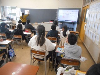 モニターと黒板を使いながら、片方が2倍、3倍になると、もう片方も2倍、3倍になることを確かめました。