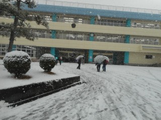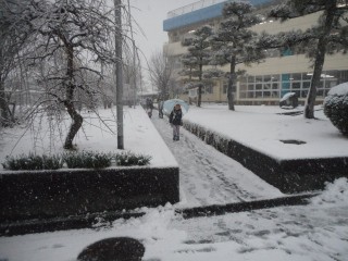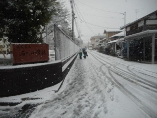 子ども達の登校時間にあわせたかのように、雪が降り始めました。