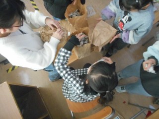 新聞紙や紙袋をくしゃくしゃにして、自分が作りたいものを作っていました。