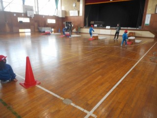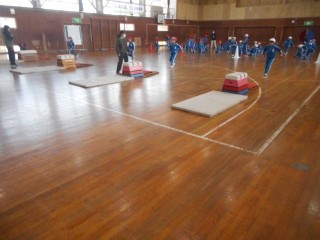 踏み切り板を踏む時に、両足をそろえる(足ジャンケンのグー)ことを確認していました。