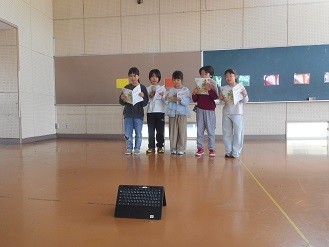 音読をタブレットで録画して、音読後にグループで確認。「もう少し音量が必要だね。」と、次の練習に向けて話し合っていました。