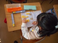 ドリルを使って、漢字の習熟を図っていました。指で空書き練習をし、その後でドリルの...