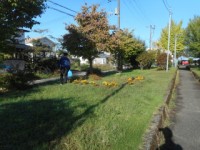 飼育栽培委員会の子どもが、校章花壇の水やりをしていました。一人でも役割を果たす姿...