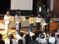 まず書道の表彰を行いました。賞状をもらう時には、全校から温かい拍手が送られました...