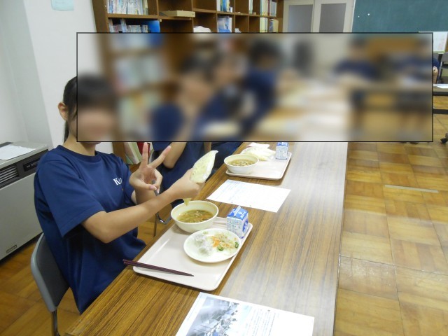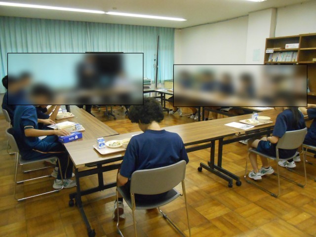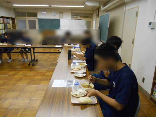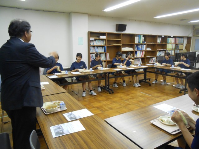 給食を食べながら校長先生と生徒会本部の生徒が話し合いました。