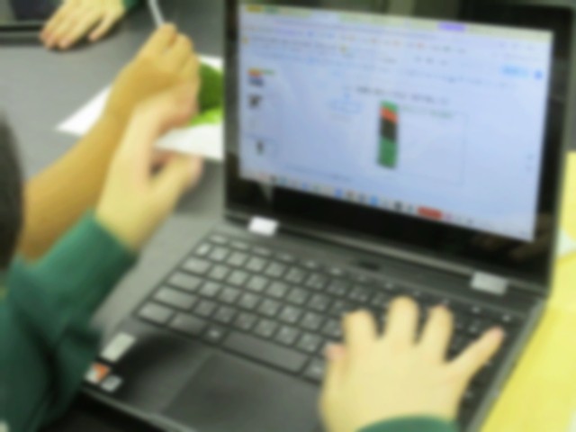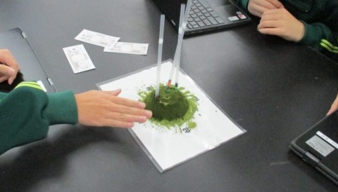 生徒たちはその模型の山の地層の報告書をタブレットを使って作っていました。