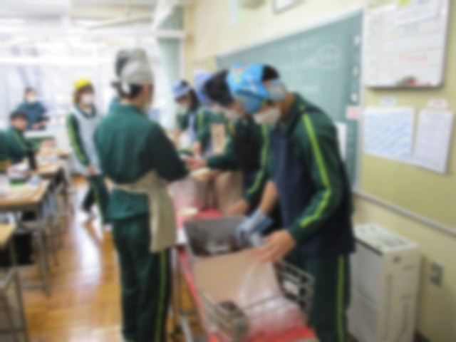 給食当番の生徒が上手に袋に入れて配膳していました。
