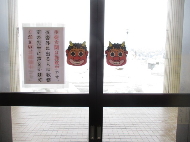 本日は節分。若宮中の生徒玄関にも鬼が来ました。