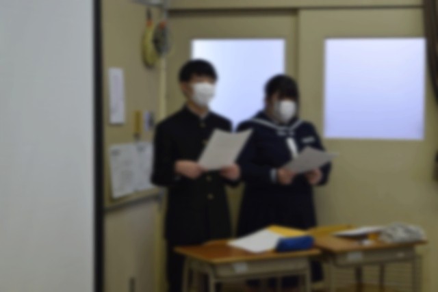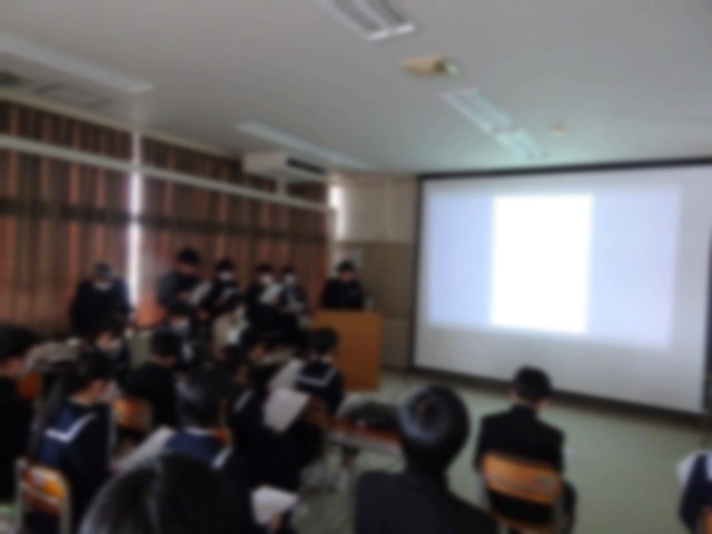 この日は年度の生徒会活動の総括を行う「生徒総会」が開かれました。この総会に先立って、先週各学級で学級討議を行い、今年のまとめが書かれている「パンフレット」の内容に基づき、今年度の成果や課題について意見交換を行いました。当日は、全校生徒が一同に集まり、今年度の「成果」と「反省点」について今年の役員の皆さんから説明がありました。たくさんの成果があがった1年だったと、改めて感じることができました。3年生が少人数な中でもいろいろな場面で工夫し、結果として充実した活動をすることができたのは、3年生の計画的な準備や様々なことを考えて取り組んだ努力のたまものだと思います。本当にありがとうございました。総会の中で、執行委員会、そして各専門委員会に向けて「感謝メッセージ」が伝えられました。今年1年間の感謝がつまったものになっていました。