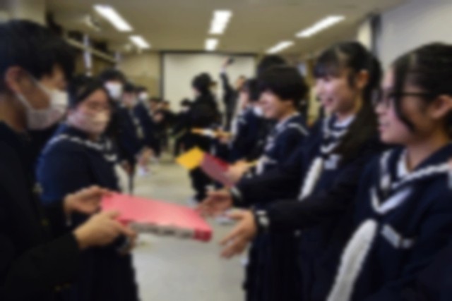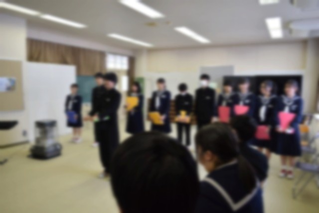 そして、総会に続いて「引継ぎ式」が行われました。先輩はファイルとともに、後輩へ「頑張って!」の思いがこもった言葉を伝えていました。新生徒会の皆さんには、先輩からの思いを十分に受け止め、次年度、さらに充実した活動となるよう、精一杯活動にのぞんでくれることを期待しています。