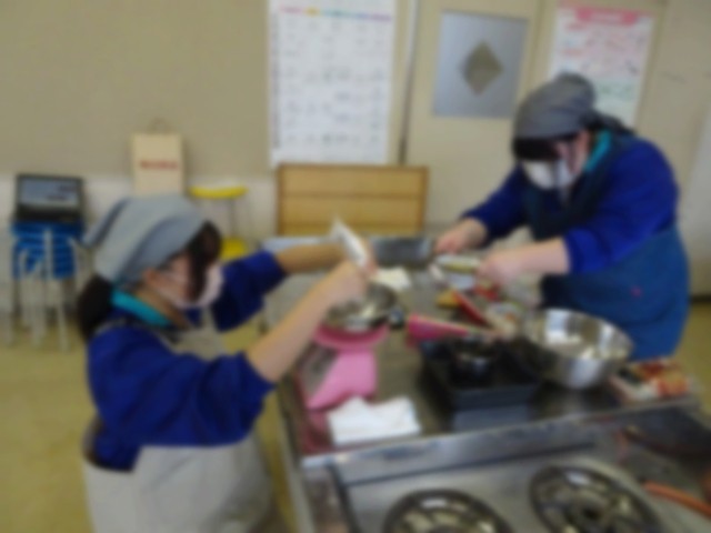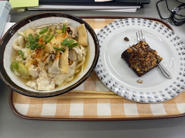 3年生だけの給食となるのはあまりにも数が少ないこともあり、今日は「調理実習」をして、自分たちで作ったお昼を食べることになりました。(一人あたりの予算は、給食費に準じた中で、という枠で計画したようです)今日はみんなで「うどん」と「デザート」を作ることにして、7人で分担してそれぞれが一生懸命調理を進めました。うどんは麺から作り、その結果、太すぎるものも細いものもありましたが、コシのある、おいしいうどんが出来上がりました。スープは出汁からとり、入れる野菜はすべて生徒が切り、具がたくさん入ったスープとなりました。デザートは「チョコレートブラウニー」で、オーブンで30分かけて焼き上げました。できあがったお昼ご飯は、最後に載せた写真のようになりました。どれもおいしく食べることができました。