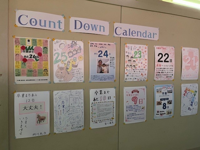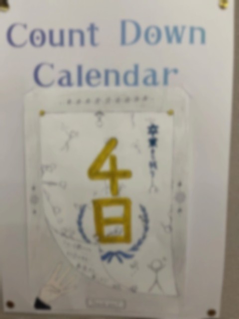 いよいよ3年生の卒業が間近となってきました。昨日の3年生教室のカウントダウンが「あと4日」・・・3年生7名にプラスして、今の須田中職員、さらにはこれまで3年生とかかわりのある先生方にもご協力いただき、カウントダウンを積み重ねてきました・・・卒業が近づくにつれ、いろいろな思いがこみあげてきていることと思います。先生方も一緒です。さらには後輩も同じ思いです・・・